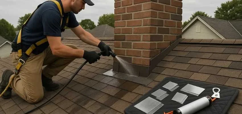 We examine crown slope, cap fit, mortar joints, brick or stone surfaces, and flashing transitions at the roofline. In Mount Hope, Hamilton this area is often the origin of leaks.